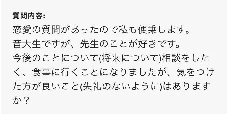 音大生ですが、先生のことが好きです。食事に行くことになりましたが、気をつけたことが良いことはありますか?